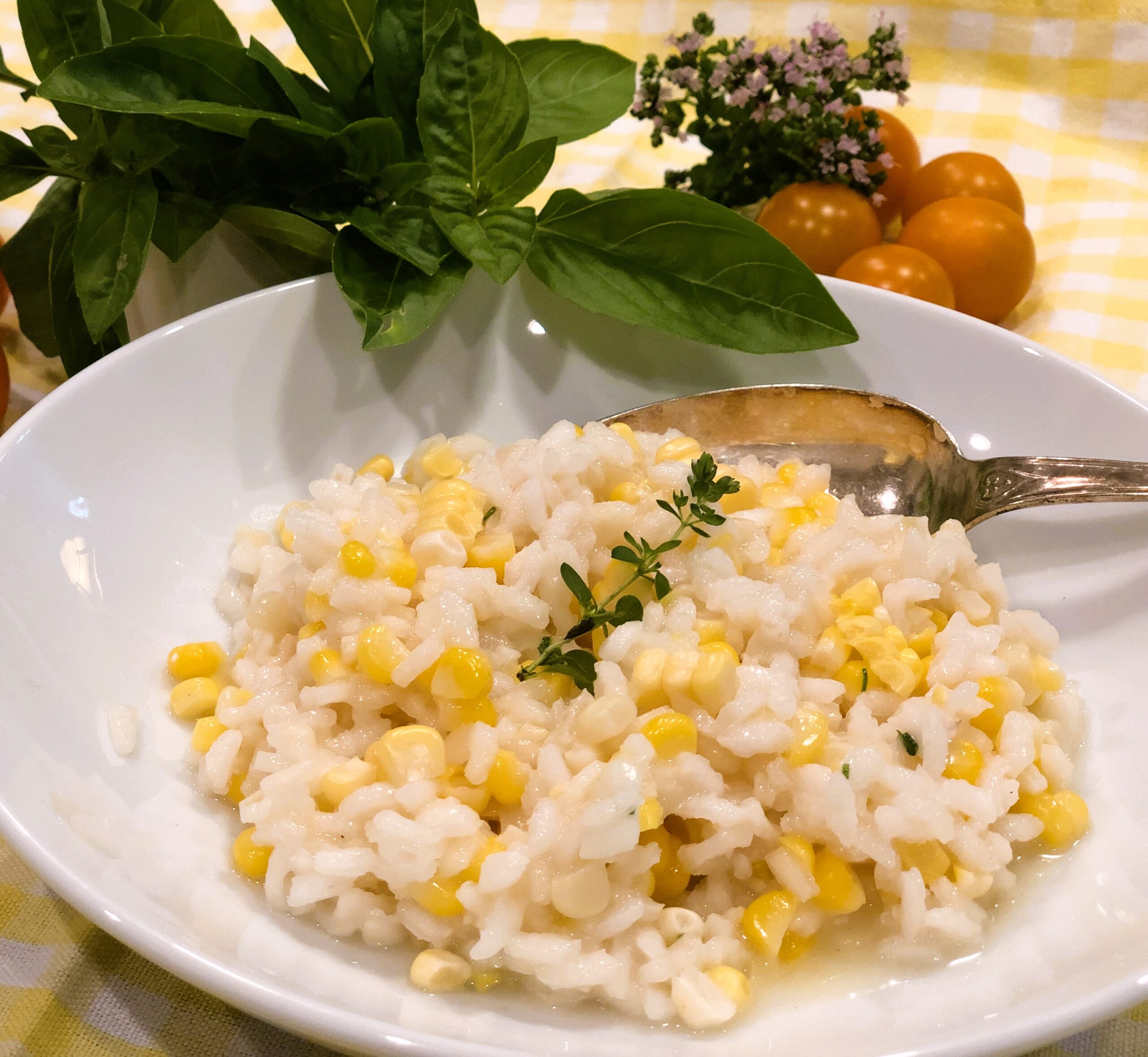 Summer Corn Risotto is a lighter version of what can often be thought of as a rich winter dish. But this recipe is all about summer. Stop by the Market and pick up fresh corn on the cob, cutting the corn from the cobs to add to the partially cooked risotto. Finish the risotto with butter, parmesan cheese, and cream. Serve as a light supper or add grilled chicken for a more robust meal.